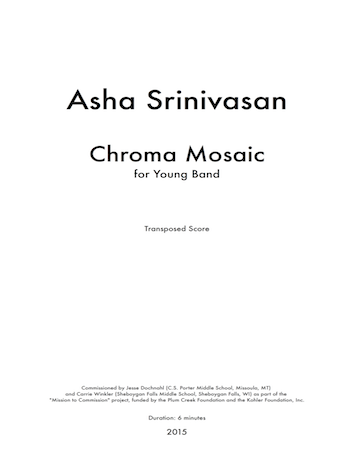 Chroma Mosaic was commissioned by two middle school directors, Jesse Dochnahl (C.S. Porter Middle School, Missoula, MT) and Carrie Winkler (Sheboygan Falls Middle School, Sheboygan Falls, WI) as part of the "Mission to Commission" project, funded by the Plum Creek Foundation and the Kohler Foundation, Inc. The Mission to Commission Project was a collaborative partnership that provided an educational opportunity for yearlong creativity, communication, and collaboration for two middle school band programs as students began writing their own music.