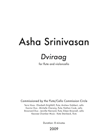 Dviraag is a fabricated word taken from the Sanskrit prefix "dvi" meaning "two" and the word "raag" loosely meaning "melodic mode." The pitch material for this piece is entirely based on a combination of two complementary pentatonic modes. The primary rhythmic material, introduced towards the beginning by the cello, was derived from a Carnatic vocal exercise I fondly remember learning as a child, in India. Of all the beginner’s exercises I learned, this one always stood out as being surprisingly challenging and unusual in its subdivisions. This exercise has become the basis for an exploration of intricate rhythmic subdivisions grouped into salient short phrases that recur throughout the piece in various contexts.