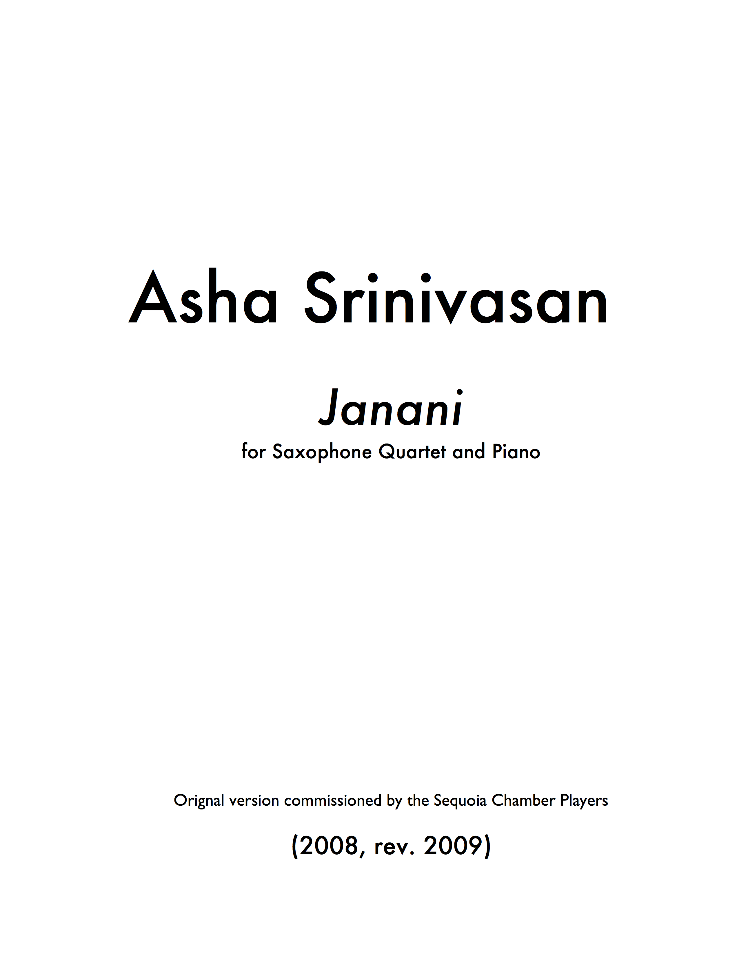 Janani was commissioned by the Sequoia Chamber Players in 2008. It was re-worked for saxophone quartet in 2009.