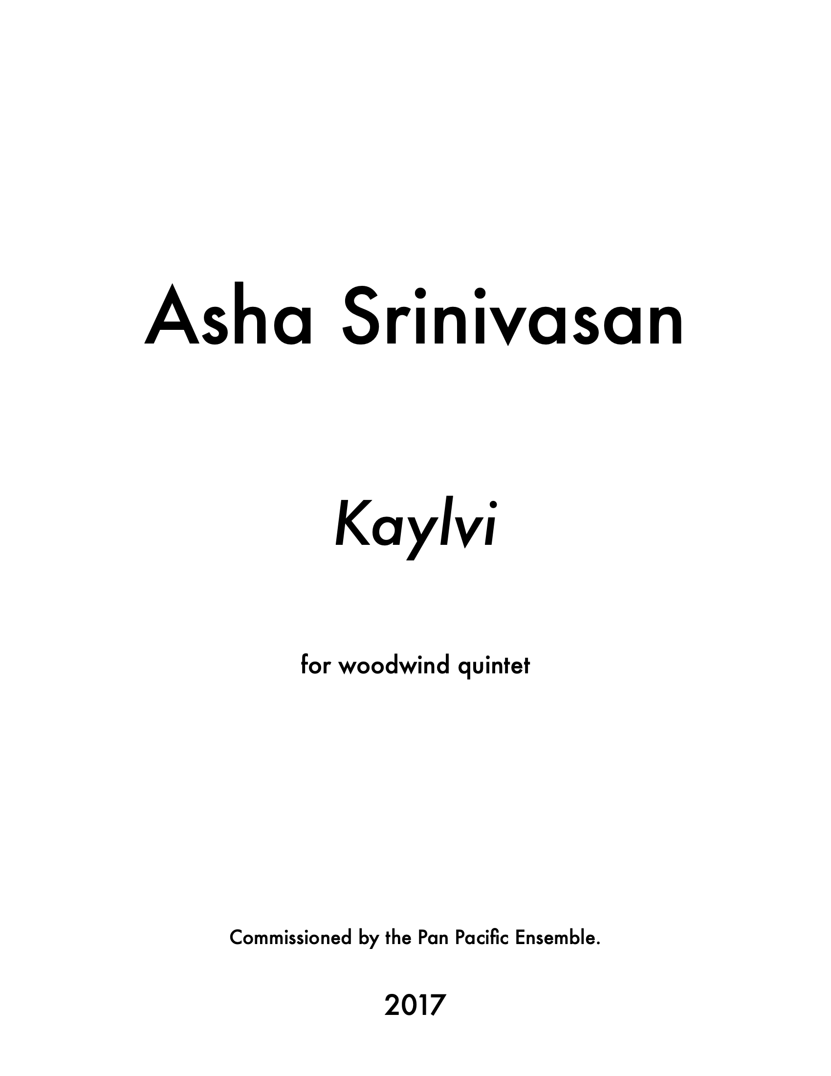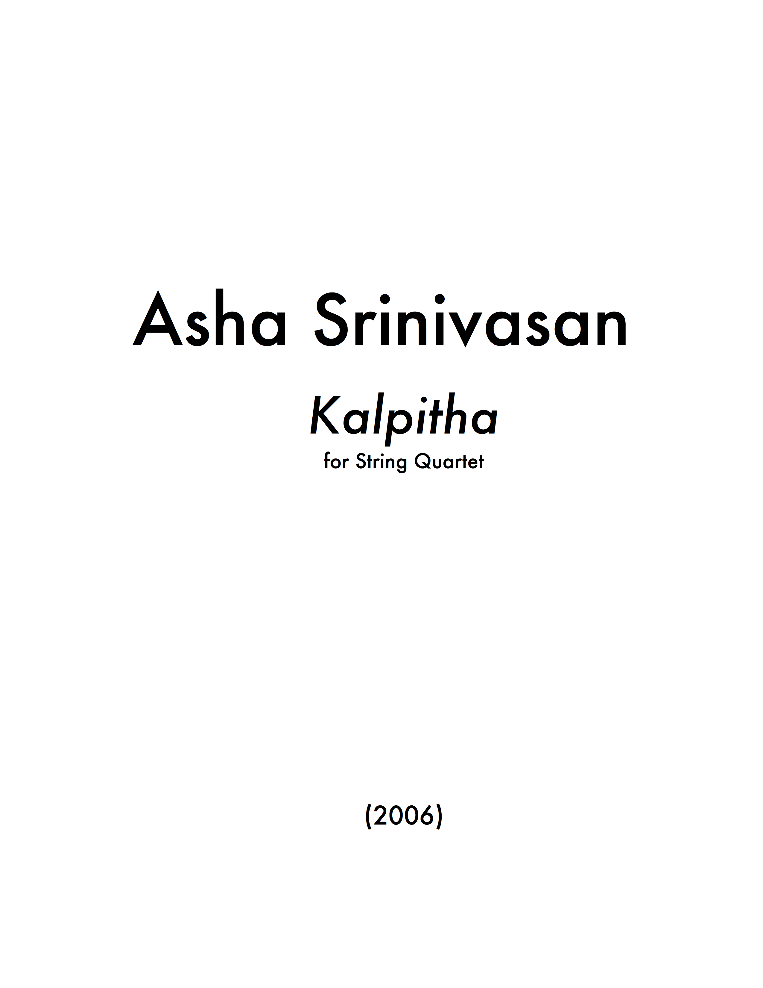 Kalpitha [kul'-pi-thaa] is set in three attached movements and is structured around opposing ideas. Mvt. I juxtaposes two drastically different gestures, first abruptly, then more smoothly. In contrast, Mvt. II's stasis is itself in opposition to Mvt. I's fluidity. Mvt. III suddenly interrupts the stasis of Mvt. II and ultimately resynthesizes the chordal, scalar, and textural manifestations of the first two into a cohesive whole.