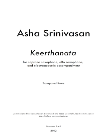 The title is a play on words combining the keerthanam form in South Indian music with the Western term sonata. The mode invented for this piece models various aspects of the Indian concept of raga, with pitches grouped in complementary sets of chromatic gestures.