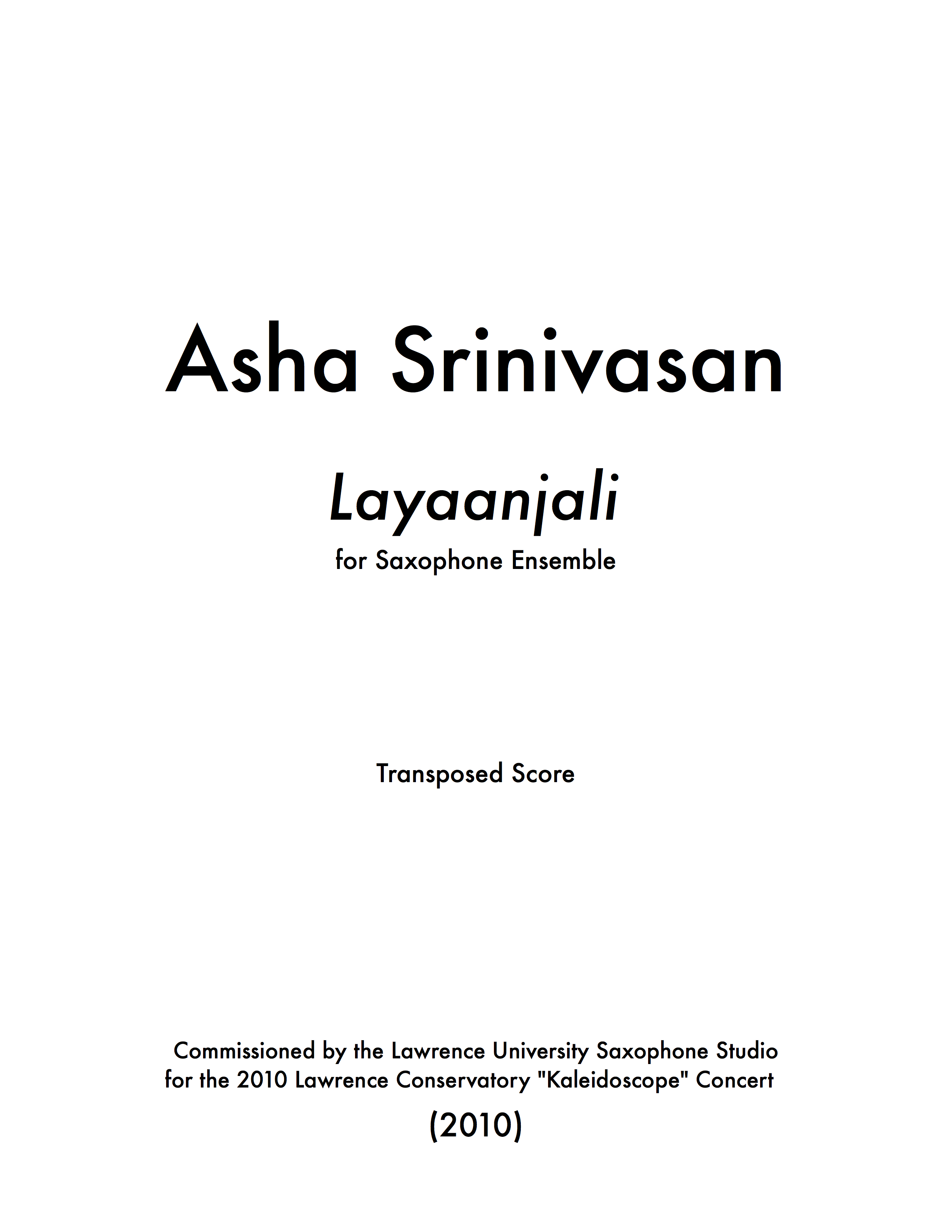 Layaanjali was commissioned and premiered by the Lawrence University Saxophone Studio for the 2010 Lawrence University "Kaleidoscope" Concert.