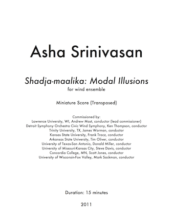 Shadja-maalika: Modal Illusions was commissioned by a consortium of ensembles through CBDNA (College Band Directors National Association), spear-headed by Andy Mast at Lawrence University. The piece has been released by Mark Records on "Lawrence University Conservatory of Music Wind Ensemble" album.