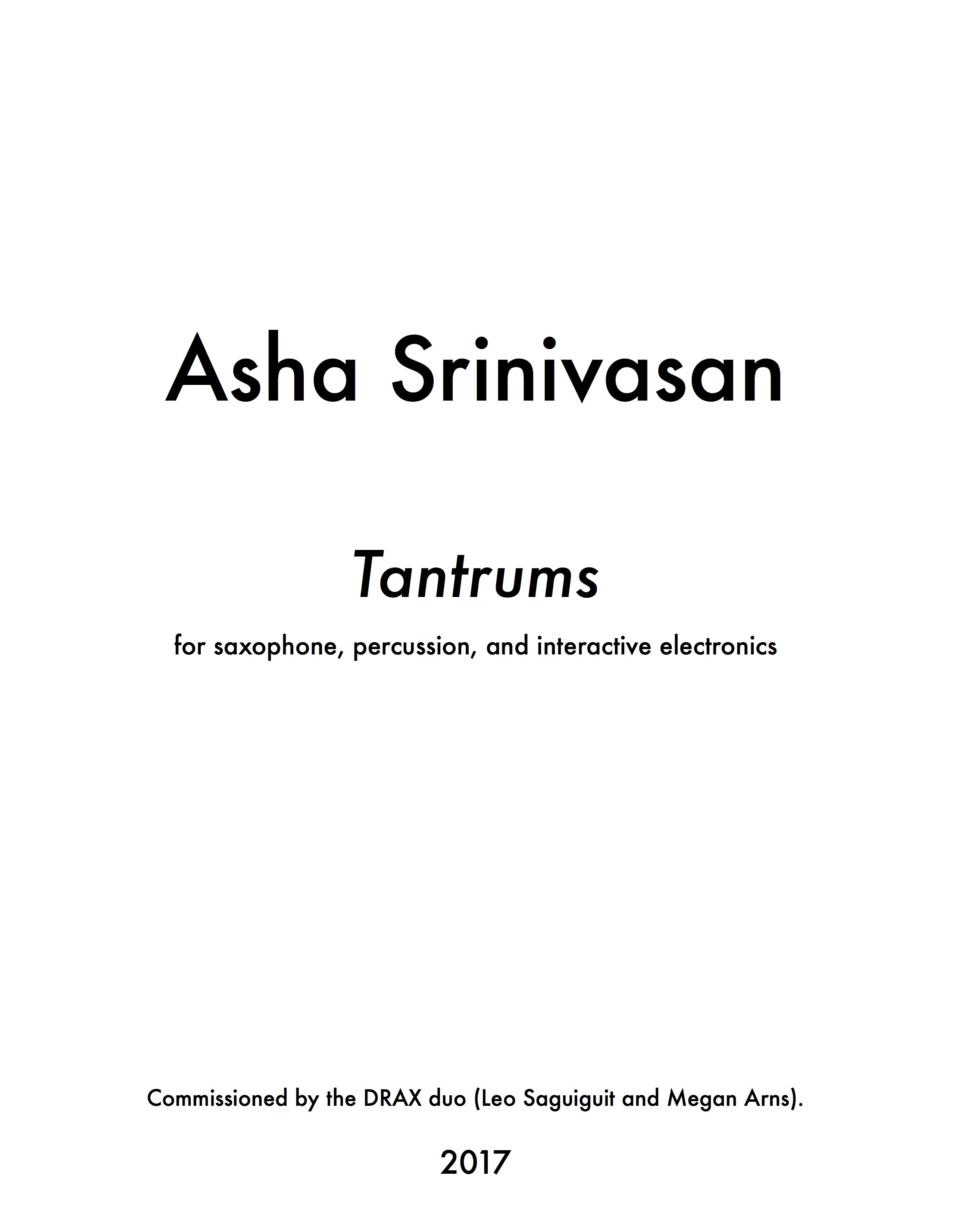 Tantrums was commissioned by the DRAX duo (Leo Saguiguit and Megan Arns) with support from the Sinquefiled Charitable Foundation and the Mizzou New Music Initiative.